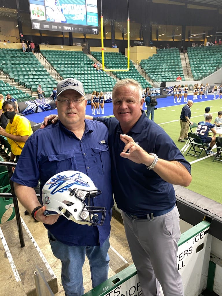 This latest instance was this past Saturday night in Frisco. My wife and I met up with Brian and fellow alum Dian Fife for dinner, and to take in the Frisco Fighters indoor football home opener. Brian and I often wondered whether the actual name of the team should be the Lions. All time Lion quarterback great Clint Dolezel is head coach, and Bob Bounds, another legendary great is a top assistant. Lance Evans is a top flight receiver, and the best Lion kicker of them all, Kristov Martinez are on the roster, although Martinez is sidelined due to injury. It was a chance to see some good football, enjoy each other’s company, and for me personally, it was the first chance in over a year to be able to celebrate my wife and I’s wedding anniversary. We were hoping to be able to speak to Clint and Bobby for a moment post game.