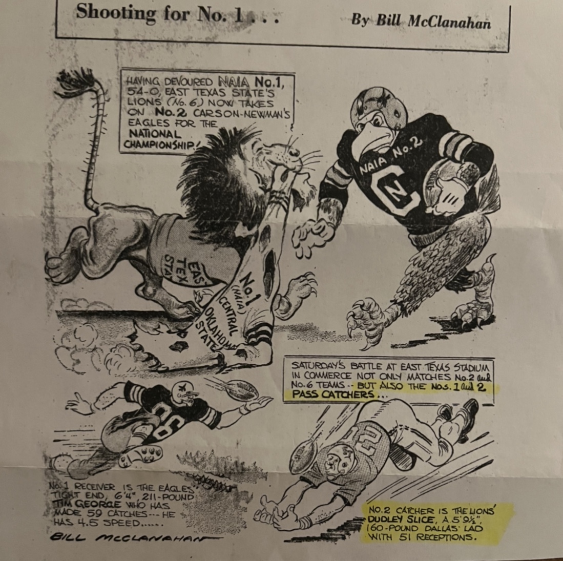 The Dallas Morning News was covering this game, as it was biggest college football game in the area. Bill McClanahan, a well known sports cartoonist, drew up this cartoon to preview the game. The Lions were slight favorites despite being ranked lower than Carson-Newman. December 9, 1972 saw thousands of people pack Commerce’s East Texas State Memorial Stadium for the battle between the # 2 Carson-Newman Eagles, and the # 6 East Texas State Lions.